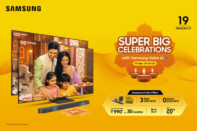 ગુરુગ્રામ, ભારત | ૨૪ સપ્ટેમ્બર ૨૦૨૫: ભારતની અગ્રણી કન્ઝ્યુમર ઇલેક્ટ્રોનીક્સ બ્રાન્ડ સેમસંગએ આજે પોતાની સૌથી મોટી તહેવારન કેમ્પેન ‘Super Big Celebrations’ (સુપર બિગ સેલિબ્રેશન્સ)ની ઘોષણા કરી છે, જે પ્રિમીયમ મોટા સ્ક્રીનવાળા ટીવી પર અતુલનીય સોદો અને રિવોર્ડ્ઝ લાવે છે તેમજ તે વિઝન AIથી સજ્જ છે. 31 ઓક્ટોબર 2025 સુધી માન્ય આ કેમ્પેન ગ્રાહકોને તેમના મનોરંજનના અનુભવને આ તહેવારની સિઝનમાં અપગ્રેડ કરવાની તક પૂરી પાડે છે. સેમસંગ એક્સક્લુસિવ ઓફર્સ પણ લઇ આવી છે, જેમાં કેમ્પેનના ભાગરૂપે કેશબેક અને રિવોર્ડઝ તેની તમામ AI ટીવી શ્રેણીમાં ઉપલબ્ધ છે. ગ્રાહકોને વધુમાં જીએસટી દરોમાં ઘટાડો થતા  ભાવ ઘટાડાનો પણ લાભ મળશે.