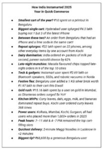 દરમિયાન, 2025માં બાકીના ભારતે ફક્ત સહજ શોપિંગ નથી કર્યું; તેણે ઇન્સ્ટામાર્ટની મદદરથી રોજિંદા જીવનને શ્રેષ્ઠ બનાવ્યું હતું. દૂધ દેશની #1 આવશ્યક વસ્તુ તરીકે ઉભરી આવ્યું હતું અને ભારતમાં દર સેકન્ડે 4+ પેકેટ દૂધનો ઓર્ડર આપવામાં આવ્યો હતો; જે 26,000 ઓલિમ્પિક કદના પૂલ ભરવા માટે પૂરતો જથ્થો કહી શકાય. ભારતમાં હૈદરાબાદના એક યુઝરે સૌથી વધુ ખરીદી કરી હતી, જેણે આ વર્ષમાં ત્રણ આઇફોન 17 પ્રો ખરીદવા માટે એક જ કાર્ટમાં ₹4.3 લાખનો ઓર્ડર આપીને ચેકઆઉટ કર્યું હતું.