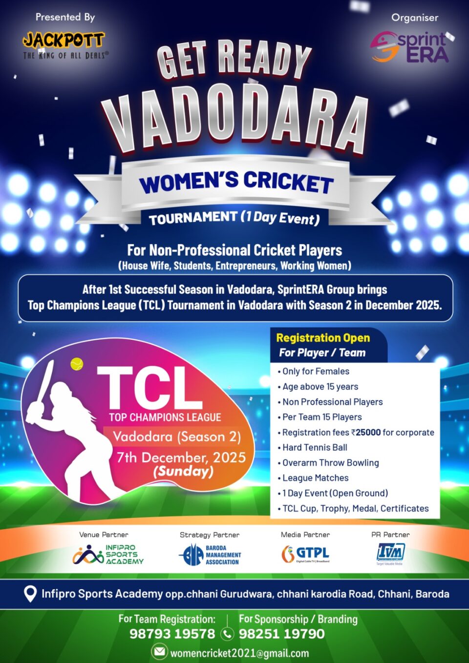 આ એક દિવસની મેચમાં નોન પ્રોફેશનલ ક્રિકેટ પ્લેયર્સ આવી પોતાનું બેસ્ટ પર્ફોર્મન્સ આપશે. આ એક ટેનીસ ટુર્નામેન્ટ હશે જેમાં 15 વર્ષની ઉપરની કોઈપણ મહિલા આ ટુર્નામેન્ટમાં ભાગ લઈ શકશે. વડોદરા ખાતે યોજાવા જઈ રહેલી TCL ટોપ ચેમ્પિયન્સ લીગ માં હાઉસ વાઈફ, સ્ટુડન્ટ્સ, વર્કીંગ વુમન, ભાગ લઈ શકશે. 7 ડિસેમ્બર ચાલુ થનારી આ ટુર્નામેન્ટના પ્રસ્તુતકર્તા છે, “ધ ક્યુબ ક્લબ”. આ ઉપરાંત આ ટુર્નામેન્ટના ઓર્ગેનાઈઝર સ્પ્રિન્ટએરાના ફાઉન્ડર નિમીષા શાહ છે, જે વુમન ક્રિકેટ ટુર્નામેન્ટ 2011થી કરતા આવ્યા છે, જેનો મુખ્ય હેતુ સ્પોર્ટસ અને મહિલાઓને પ્રોત્સાહન આપવાનું છે.
