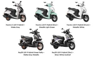 તાજેતરના ફીચર અપગ્રેડને પૂરક બનાવતા, Fascino S 125 Fi Hybrid, હવે સ્ટાઇલિશ મેટ ગ્રે કલરમાં ઉપલબ્ધ છે. Fascino 125 Fi Hybrid ડિસ્ક-બ્રેક વેરિઅન્ટમાં તાજગીભર્યું મેટાલિક લાઇટ ગ્રીન કલર છે, જ્યારે ડ્રમ-બ્રેક વેરિઅન્ટમાં ભવ્ય મેટાલિક વ્હાઇટ કલર છે. આ ઉપરાંત, RayZR 125 Fi Hybrid Street Rally બોલ્ડ મેટ ગ્રે મેટાલિક કલરમાં ઓફર કરવામાં આવે છે, અને RayZR 125 Fi Hybrid ઇન ડિસ્ક વેરિઅન્ટમાં સ્પોર્ટી સિલ્વર વ્હાઇટ કોકટેલ શેડ છે.